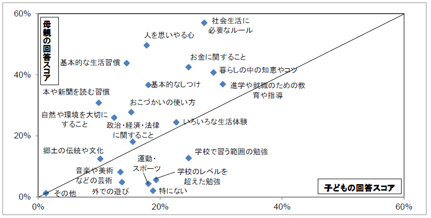 - "母親が子供に今後教えたいこと"と"子どもが親に教えてもらいたいこと"を比較すると、母親の方が子どもより選択する割合が高い傾向であった。逆に子どもの方が母親より選択する割合が高いものとしては、「運動・スポーツ」(子ども18.1%、母親4.3%、と13.7ポイント差)、「学校のレベルを超えた勉強」(子ども19.3%、母親5.6%、と13.7ポイント差)、「学校で習う範囲の勉強」(子ども24.7%、母親12.7%、と12.0ポイント差)、「外での遊び」(子ども13.7%、母親4.8%、と8.9ポイント差)となった。