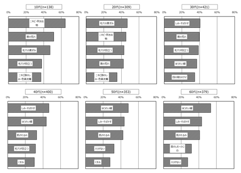 20代は「毛穴の黒ずみ」「ニキビ・吹き出物」「毛穴が目立つ」が4割台で、"毛穴"への悩みが目立ちます。
