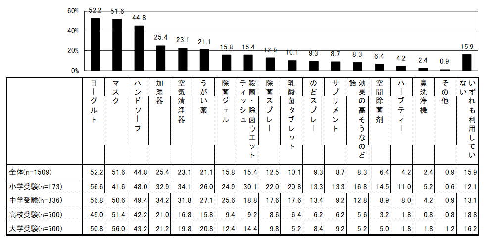 ・小学受験・中学受験では「ヨーグルト」が56.6%、56.8%と最も高く、高校受験・大学受験では「マスク」が51.4%、56.0%と最も高い結果となりました。