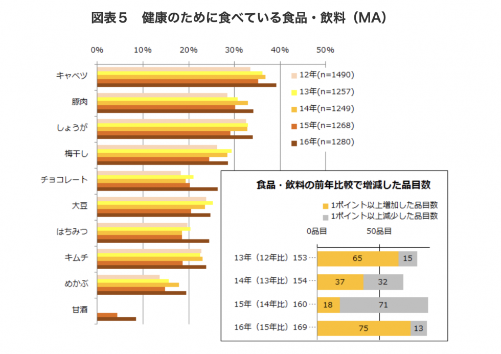 「チョコレート」「はちみつ」は、12年から15年まであまり変化がなかったのですが、16年で一気に増加しています。「めかぶ」「キャベツ」「豚肉」は、年々増加傾向(15年を除く)で、12年と比べると5ポイント以上の増加となりました。