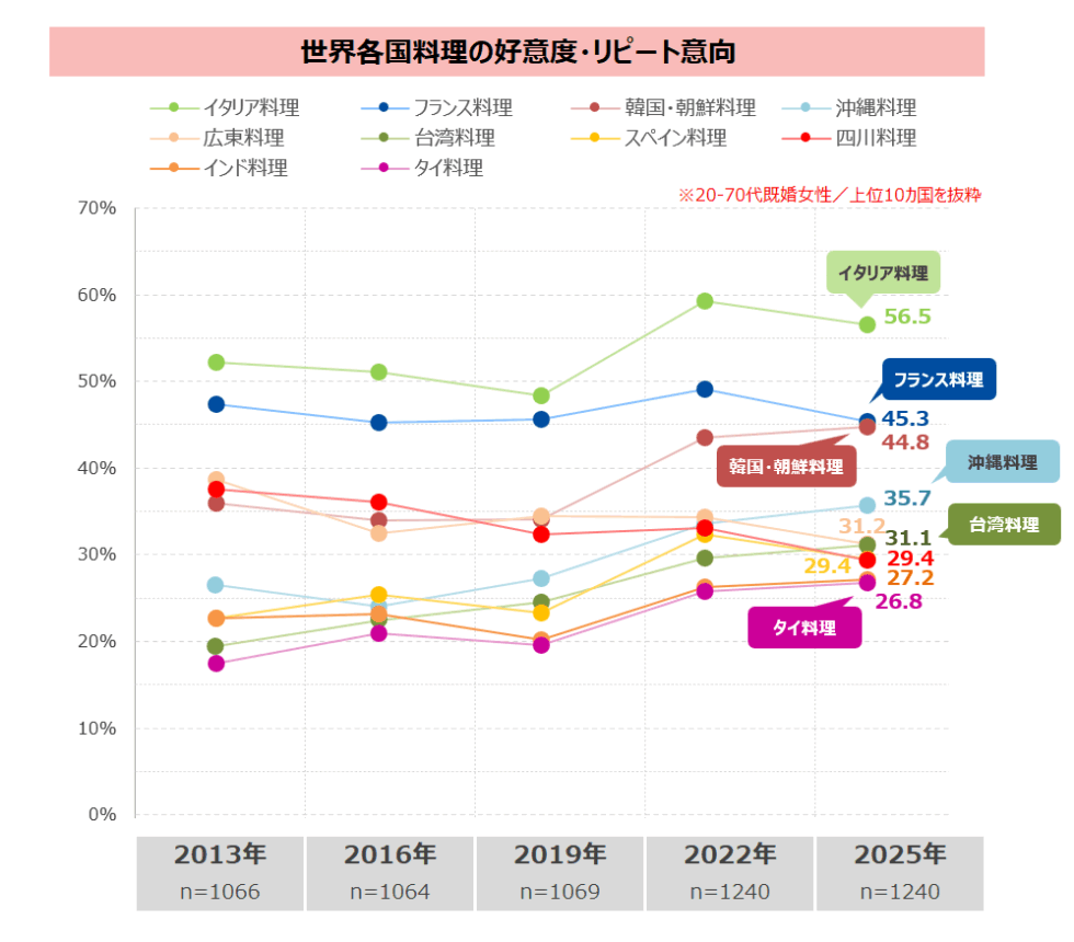 40以上ある各国料理について、「好き・もう一度食べたい料理」を20-79歳の既婚女性に対して調査したところ、「イタリア料理」が最も高く、次いで「フランス料理」「韓国・朝鮮料理」と続く結果となった。時系列でみると、上位2位の「イタリア料理」「フランス料理」は10年以上前から大きな変化はみられない。一方で「韓国・朝鮮料理」「沖縄料理」「台湾料理」「タイ料理」は、いずれも10ポイント前後伸長している。なお、「広東料理」「四川料理」といった中華料理の地域別分類は好意度が減少傾向にある。