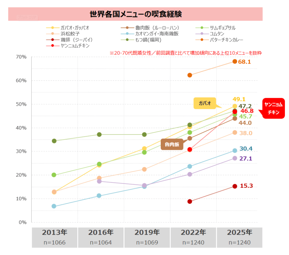 150以上ある各国のメニューの中で、3年前(2022年調査)と比べて、喫食経験が10ポイント以上増加したメニューは「ヤンニョムチキン」のみだった。次いで「ガパオ・ガッパオ」「魯肉飯(ルーローハン)」がいずれも8ポイント以上の増加。また、3年前と比べて特に増加傾向だった上位10メニューについて、2013年(または調査開始時)と比較すると、すべてのメニューで伸長がみられた。なかでも「ガパオ・ガッパオ」は30ポイント以上増加しており、「サムギョプサル」「浜松餃子」「カオマンガイ」も20ポイント以上増加している。全体として、ヨーロッパ・アメリカ系のメニューに比べて、アジア系メニューの伸長が著しい。