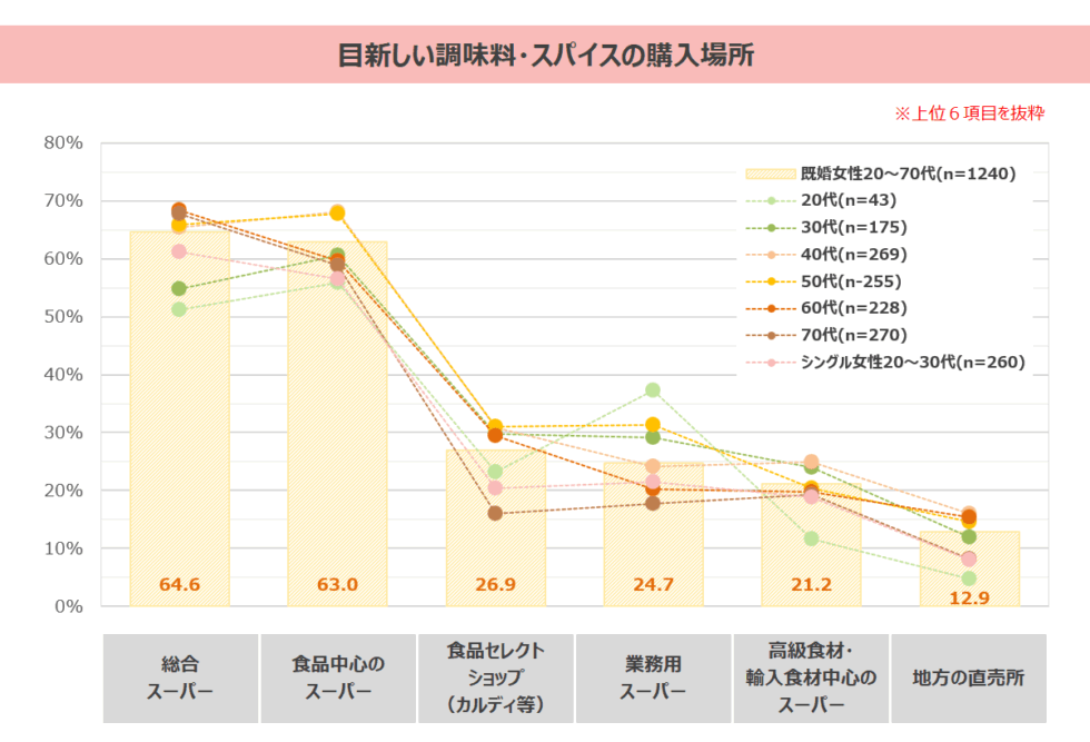 最近新たに購入・入手した調味料があるかどうかを調査したところ、2割が「ある」と回答した。目新しい調味料・スパイスを購入する場所としては、「総合スーパー」「食品中心のスーパー」が6割台で最も高く、次いで「食品セレクトショップ(カルディ等)」「業務用スーパー」が続く。「食品セレクトショップ(カルディ等)」は30-60代の既婚女性においていずれも3割前後で、「業務用スーパー」は20代の既婚女性が4割弱と高い。
